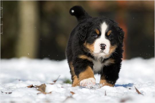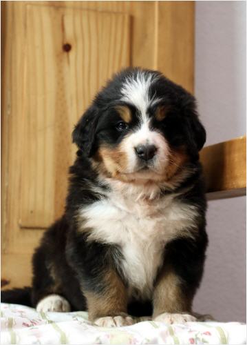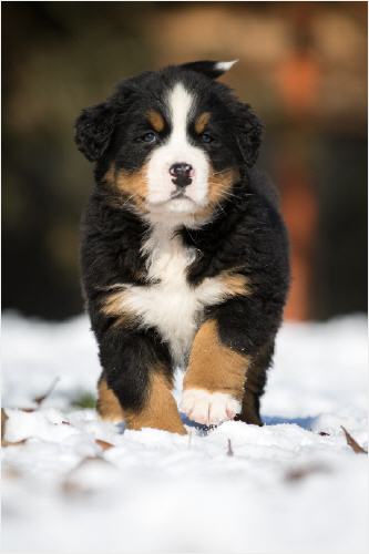 Was an diesem großen, langhaarigen Hund zuerst ins Auge springt, ist die klar abgegrenzte, symmetrische Zeichnung der drei leuchtenden Grundfarben. Der tiefschwarze Mantel wird umsäumt von rostroten Abzeichen und die weiße Blässe, die weiße Brust sowie die weißen Pfoten und Schwanzspitze putzen den Berner Sennenhund sonntäglich heraus.